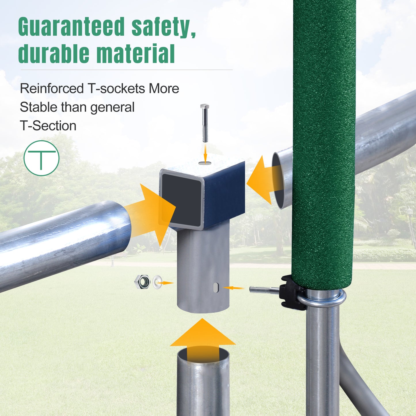 - [Excellent Structure and Materials] The mainframe of the trampoline is supported by high-quality galvanized steel, 4 sets of sturdy leg tubes, and 8 sets of high-quality protection poles to provide maximum bearing capacity and protection, which can fully hold the unlimited vitality of children. The top rails are fixed with specially designed and extra reinforced T-joints to provide excellent stability, and the upgraded W-shaped leg assumes the sturdy base function.