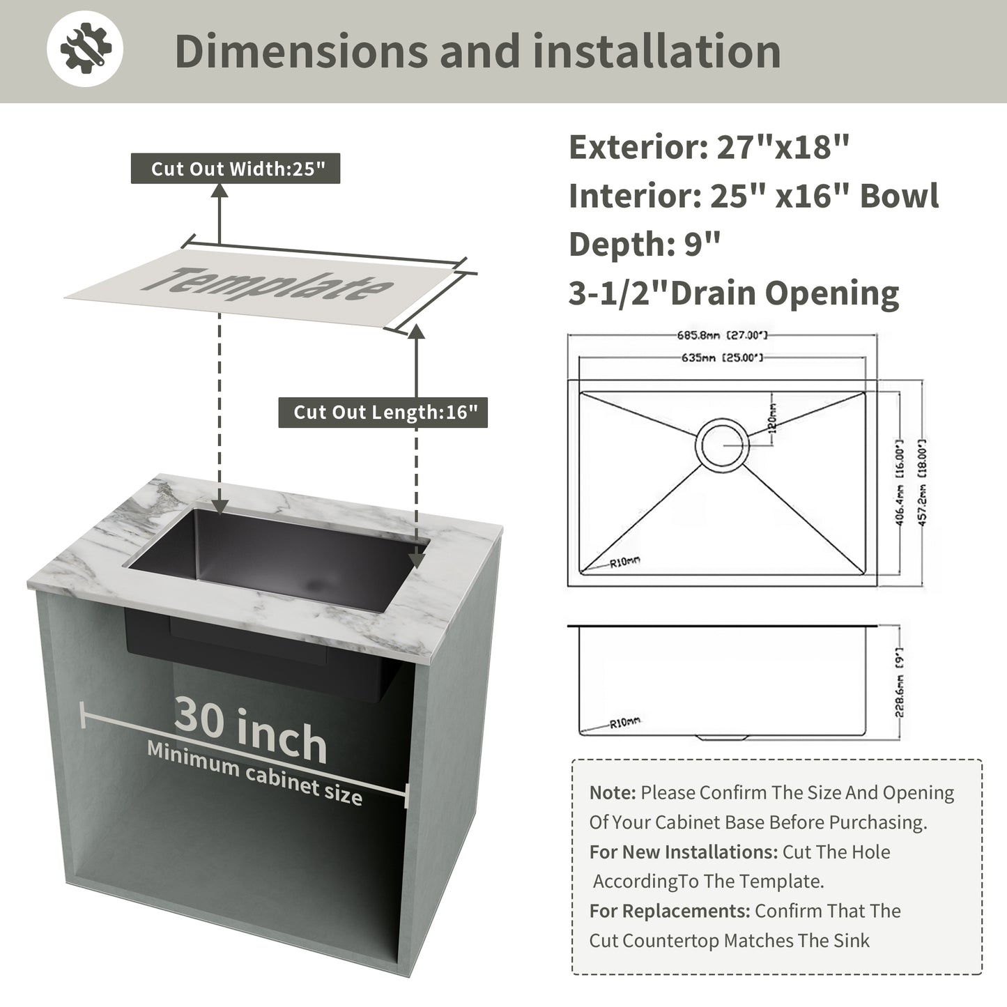 - 27 in. L x 18 in. W x 9 in. D. Minimum cabinet width 30 in. Single Bowl kitchen sink.