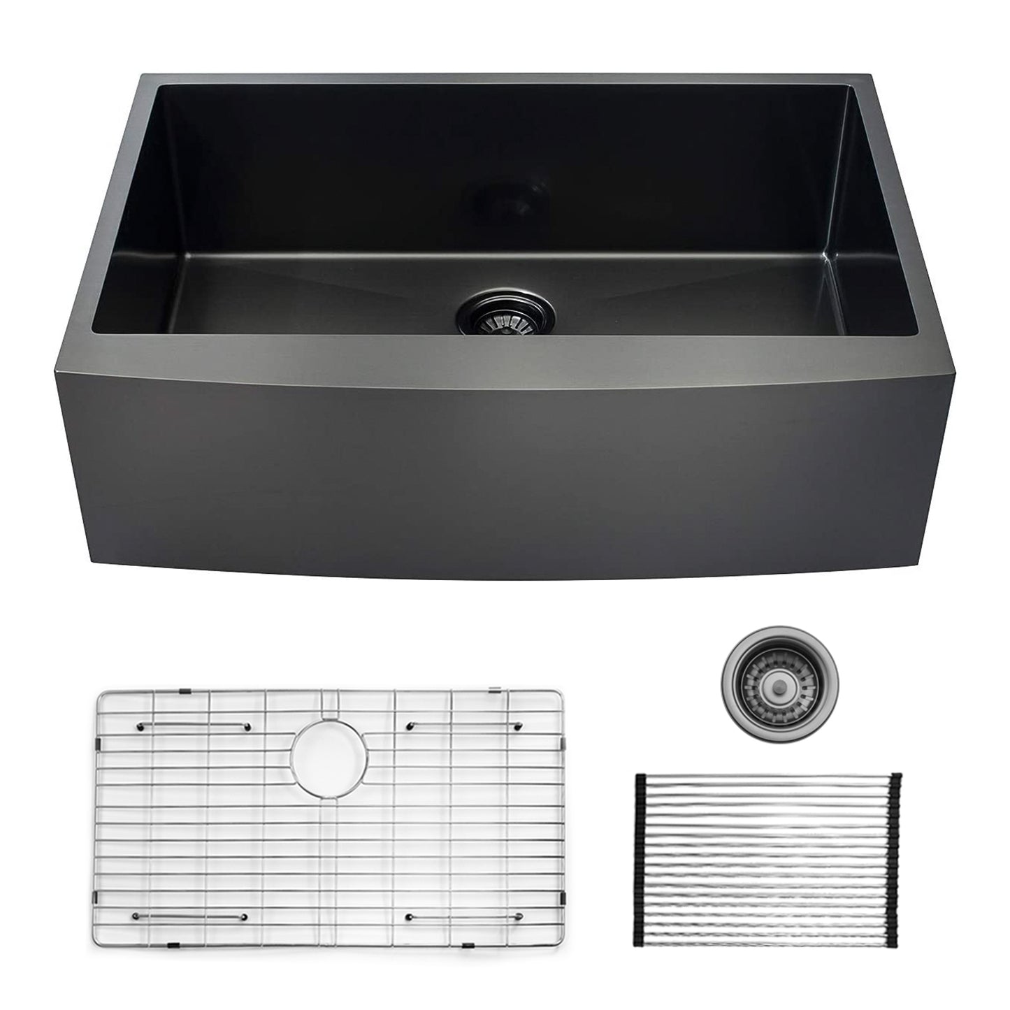 - Gunmetal black stainless steel single bowl kitchen sink 10 Inch deep farm sink allows you to soak and clean large cookware and bakeware.Handcrafted by skilled artisans, the bottom is slightly tilted to prevent water from staying in the sink. X grooves design is easy to drain, Rear set drain matches most kitchen appliances.