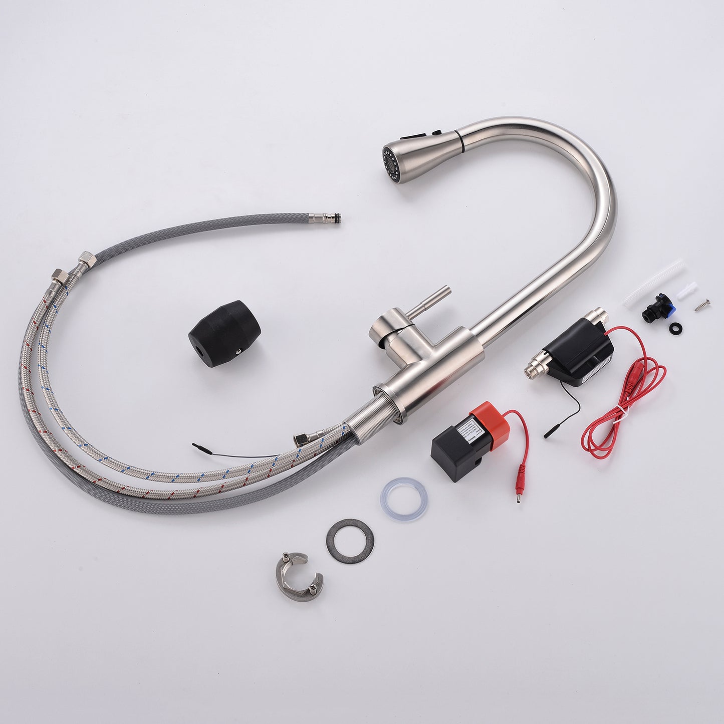 Touch-On Kitchen Faucet with Pull Down Sprayer Single Handle Brass Kitchen Sink Automatic Water Savingtechnology - Different Form The Traditional Kitchen Faucet With Pull Down Sprayer, Our Touch On Faucet For Kitchen Sink Is Controlled By Touching High Arc Goose Neck.The Kitchen Faucet Will Automatically Turn Off After Three Minutes When You Forgot To. Different Water Output Effect - Kitchen Faucet Has 3 Modes(STREAM,SPRAY). STREAM For Filling Water, SPRAY For Rinsing, Easy Installation -- Complete Tool Accessories Are Included In The Package. US Standard 3/8' Water Hose Can Fit Most US Kitchen. Assistive Touch Control Technology -- Unlike Traditional Kitchen Faucets, Touch On Faucet Simply Controls The Flow Of Water By Touching The Spout Or Body Of The Kitchen Sink Faucet. When Not Convenient To Press The Button, You Can Use The Back Of The Hand To Touch Gently. We Achieve A Nearly Contactless Cleaning Design Of The Faucet.