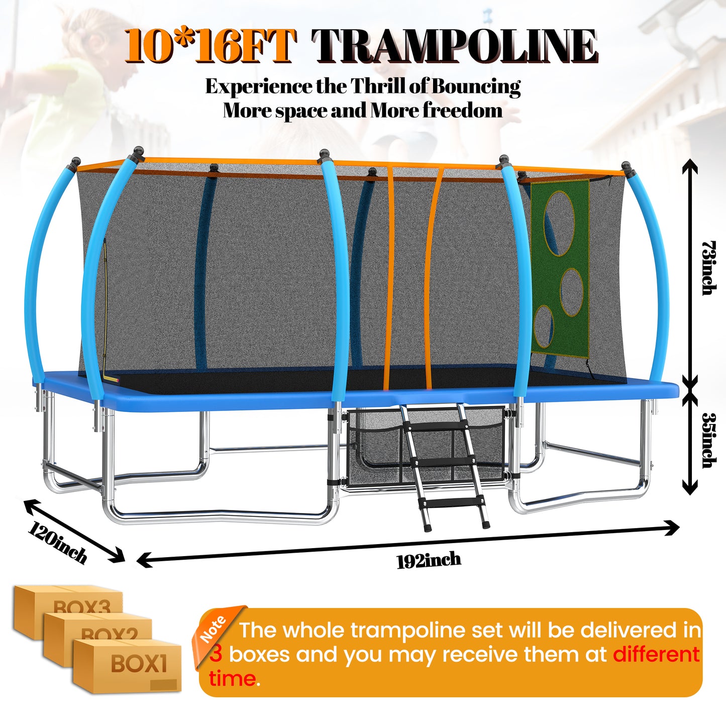 - Safety First-10*16FT Trampoline is equipt with 8 high safety enclosure poles and heavy gauge galvanized rust resistance steel construction. 4 W-shaped legs secure stability.
