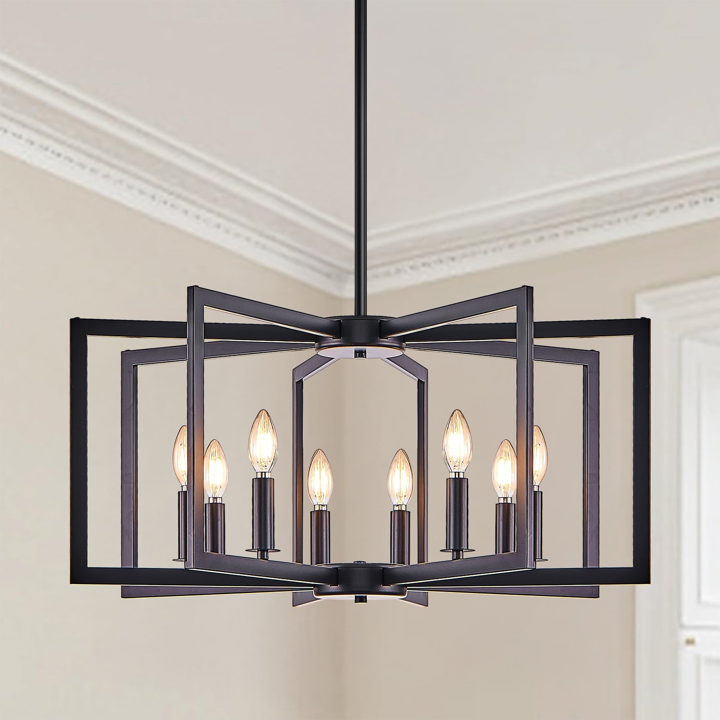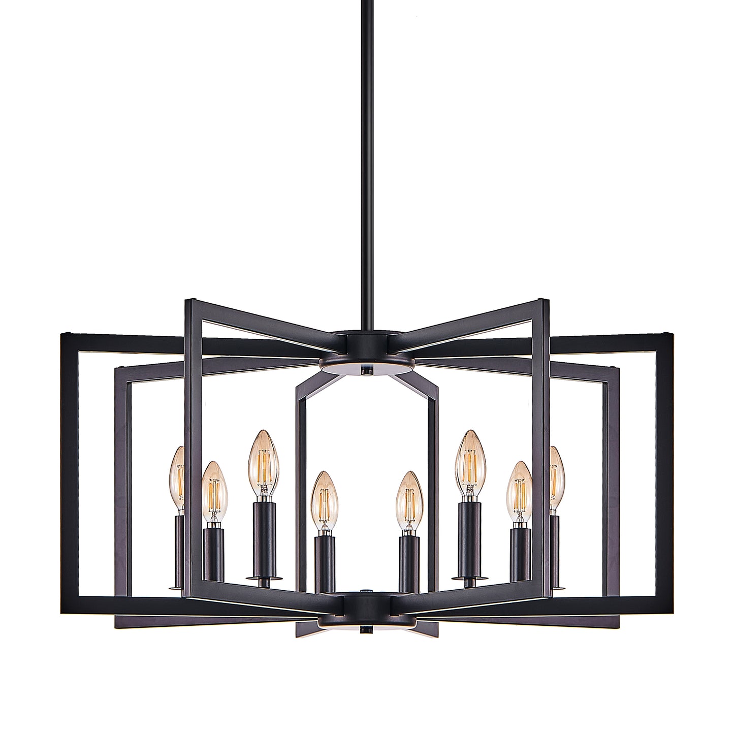 27' Modern Black Geometric 8-Light Chandelier – Industrial Metal Pendant Light Fixture for Living Room, Dining Room, or Kitchen (Bulb Not Included)