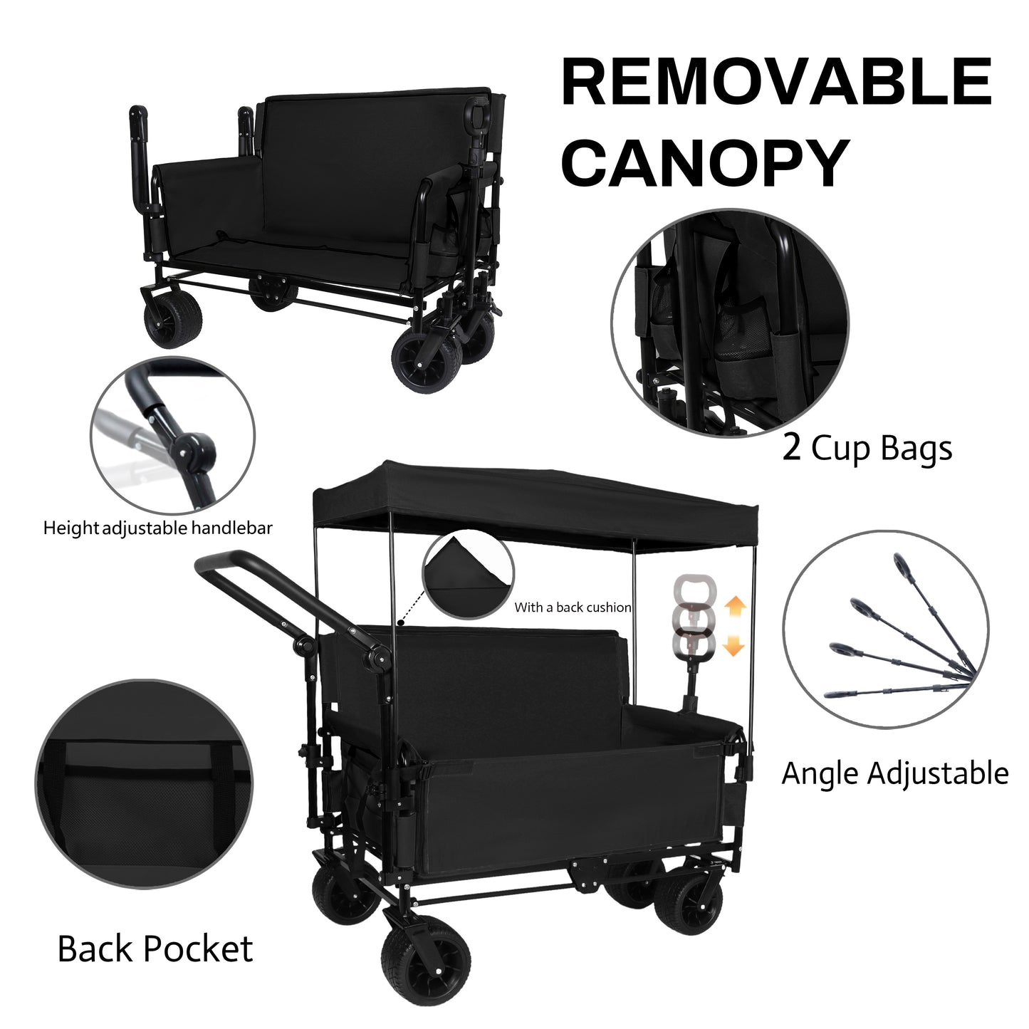 - Unique design: This wagon has handles and push handles that can rotate and adjust the angle, making it easy to turn whether you are pushing uphill or pulling through narrow spaces. Equipped with a detachable canopy that can block sunlight or rainwater