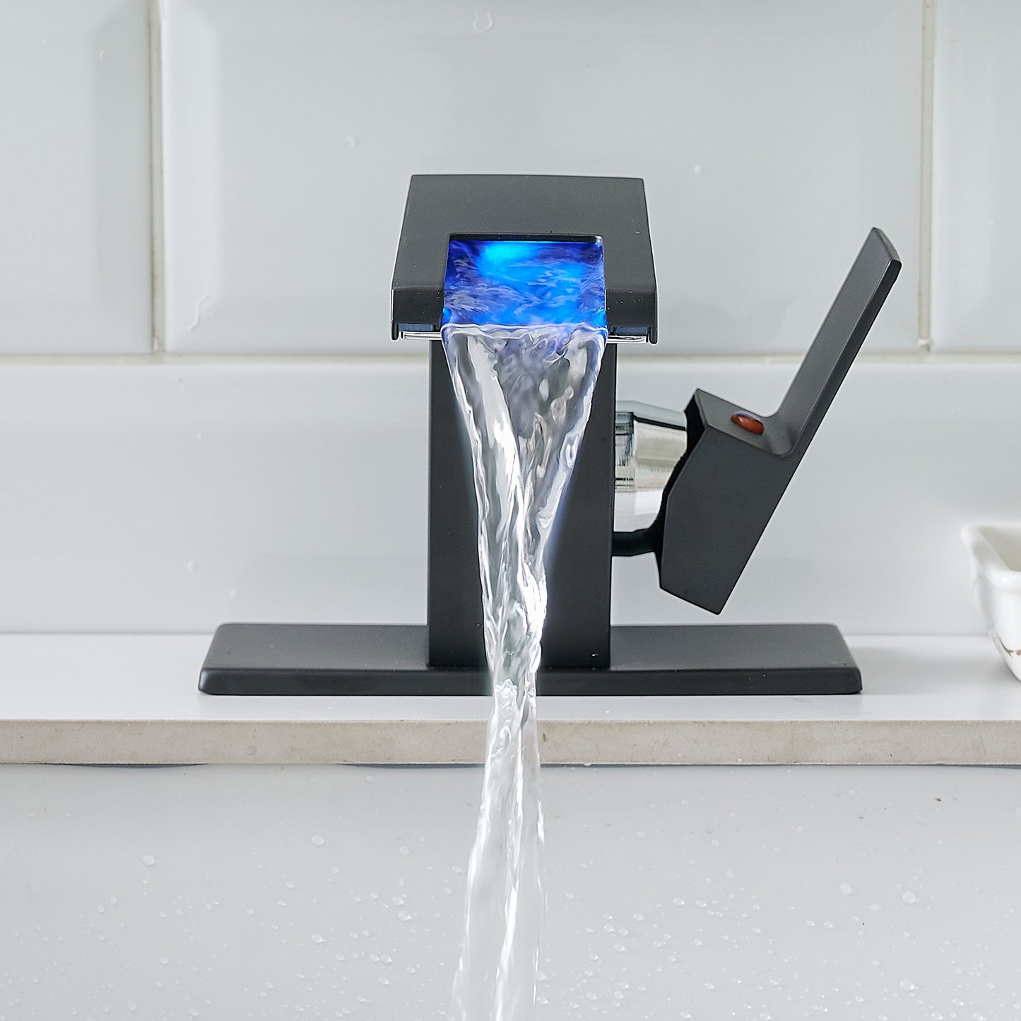 Bathroom Sink Faucet LED Light 3 Colors Changing Waterfall Glass Spout Hot Cold Water Mixer Single Handle One Hole Deck Mounted Bathroom Faucet Black Lavatory Vanity Basin Bath Plumbing Fixtures