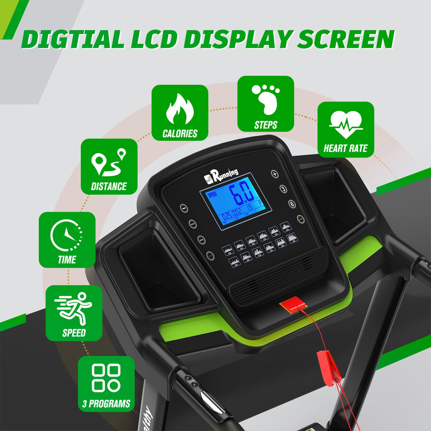 - LED DISPLAY & HIGH QUALITY RUNNING AREA - ThIS compact treadmill has a clear LED screen that displays the running distance, running speed, running time, Calorie consumption, and heart rate in real time. A quick glance shows your current state of health. The running belt uses grass-like texture design, which brings anti-skid function and more comfortable running experience. The running area is 41.3'*16.5'