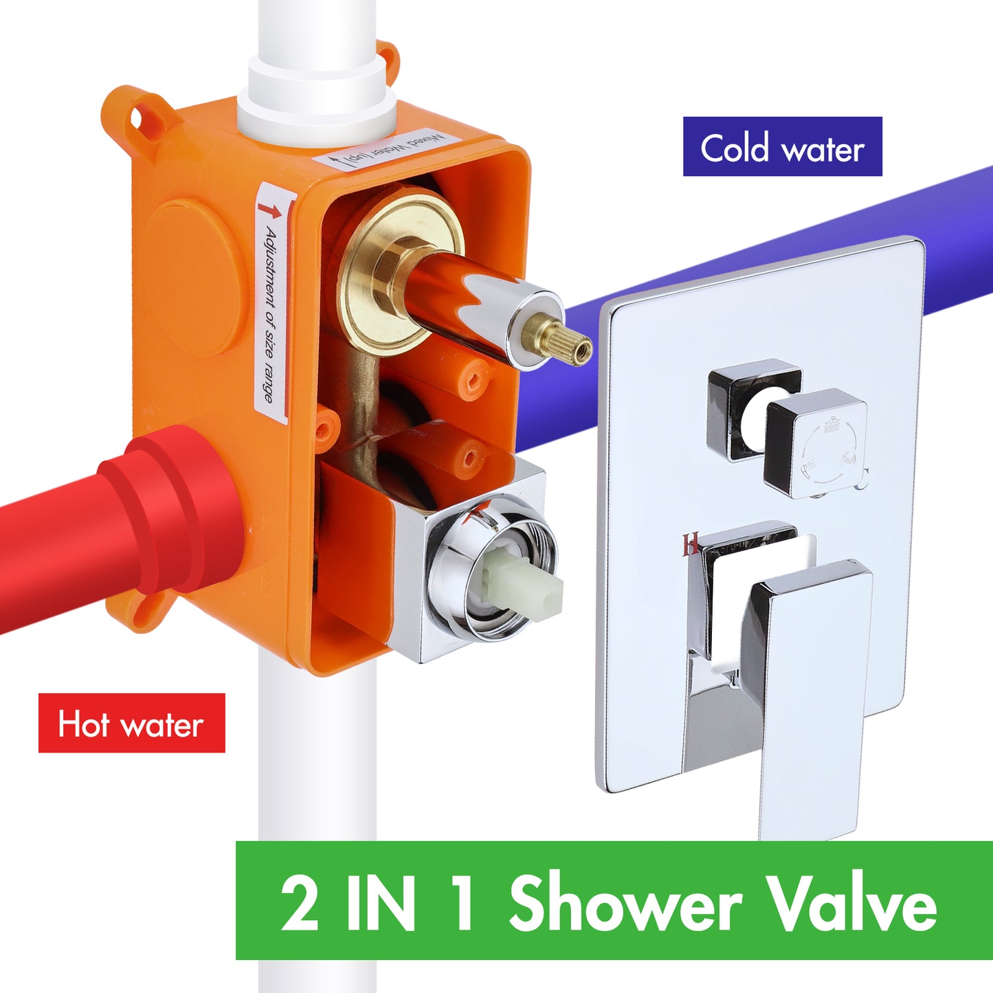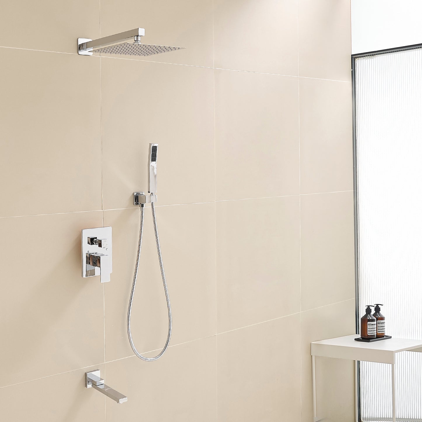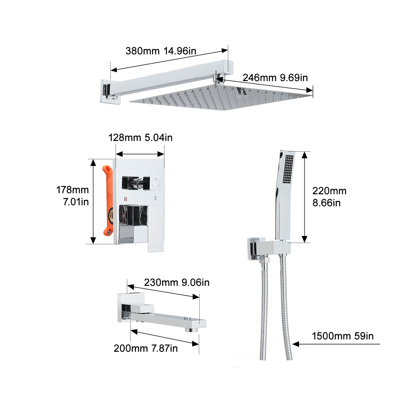 Included - This Shower kit include 10” square fixed shower head (304 stainless steel), Multifunction (2 In 1) hand-held shower head with Sprayer (brass), 15” shower arm wand (304 stainless steel), 59” shower hose (stainless steel),and 9''Down Sprayer shower holder (brass) and Shower Faucet Rough-in Valve Body (brass), all you need for having the ultimate shower experience!