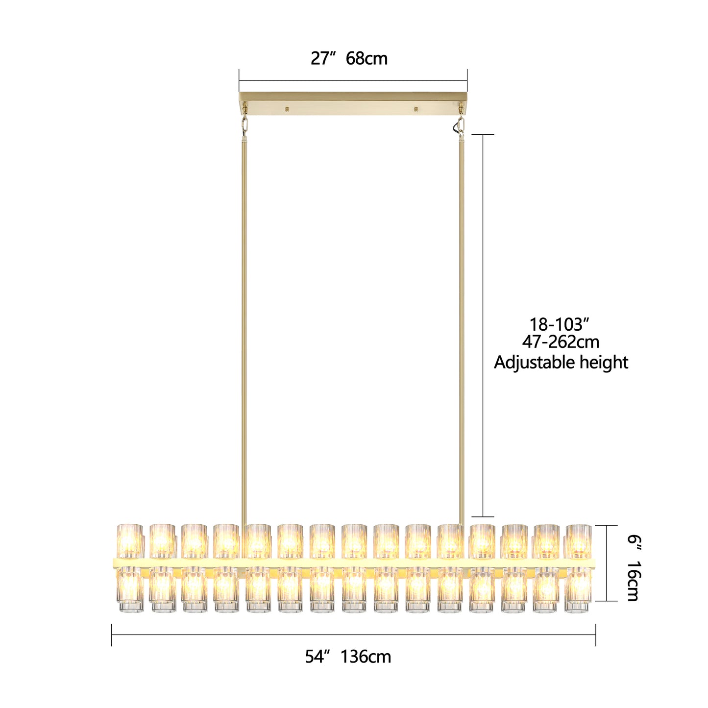 - Height Adjustable: Luxury chandeliers a rectangle design, this modern gold chandelier light fixture measures 54 inches in length, 9 inches in width, and 13.25 inches in height. It comes with four 18-inch length adjusting rods, allowing for a maximum height of 72 inches. With a weight capacity of up to 38 pounds, it's perfect for modern minimalist aesthetics.