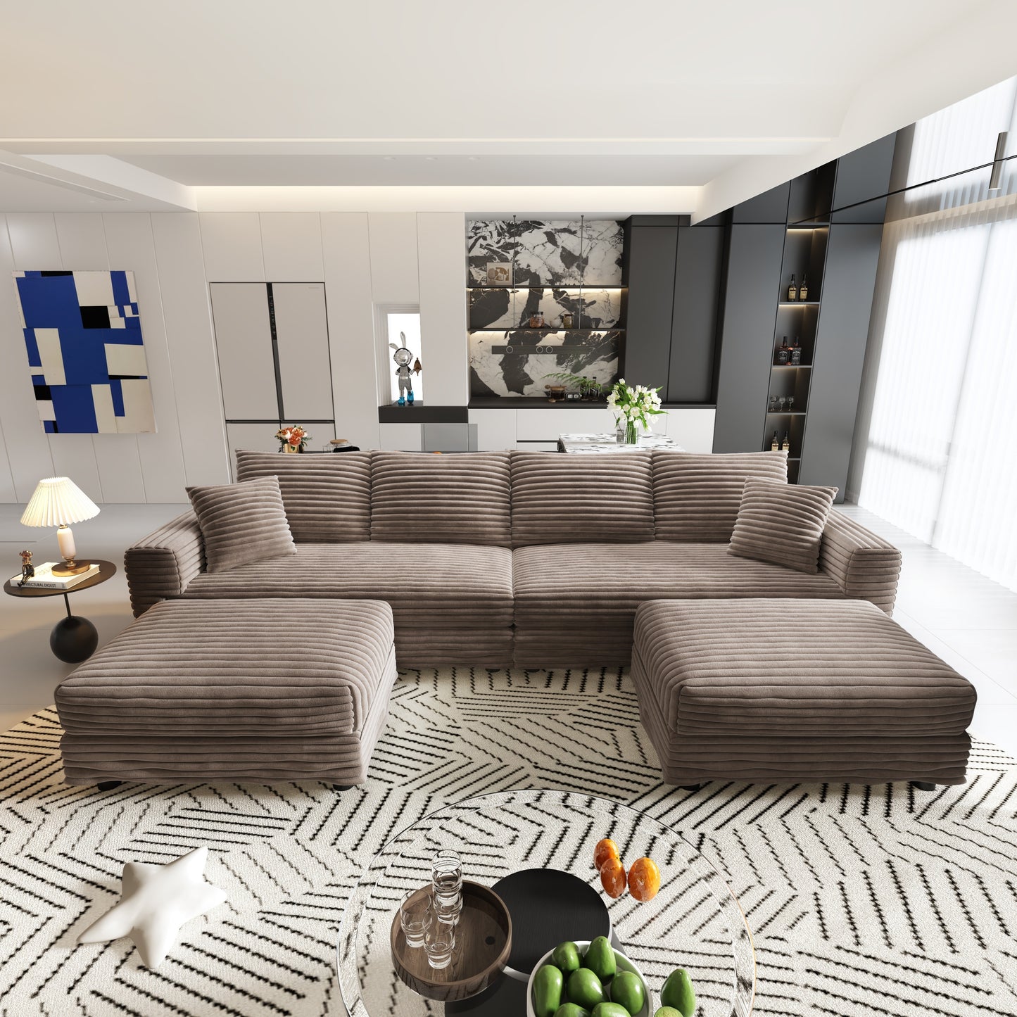 This sofa is designed for ultimate comfort, combining exquisite craftsmanship and user-friendly features to create a comprehensive relaxation experience for you. The sofa is filled with high-density sponge and high-quality cotton, paired with carefully designed rear pillows and luxurious cushions, providing unparalleled full body support. Whether it's reading or daily rest, you can enjoy cloud like comfort. Its sturdy solid wood frame and metal spring seat cushion can support up to 1000LB of weight, making it rock stable when used by four adults. The frame is durable and will not deform. The surface is made of skin friendly plush corduroy fabric, which feels soft as silk and has a unique texture. The accompanying multifunctional footstool can be freely adjusted in position, can extend into a segmented/U-shaped sofa, or can be used as a standalone footstool or small coffee table. The sofa can be easily converted into a recliner mode to meet various leisure scenes. Easy to install, assembly can be completed in just 10 minutes (note: vacuum packaged seat cushions need to be left to stand for 48 hours to restore their original state), showcasing quality in every detail from materials to functionality, redefining a comfortable home experience.