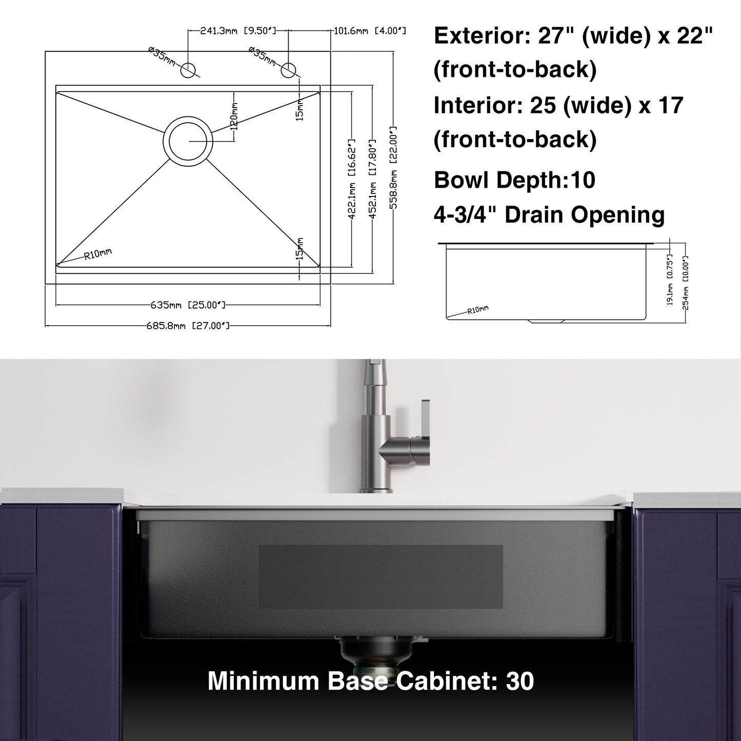 - 27 in. L x 22 in. W x 10 in. D. Drop-in sink installation; minimum cabinet cut out size 30 in. Single bowl kitchen sink