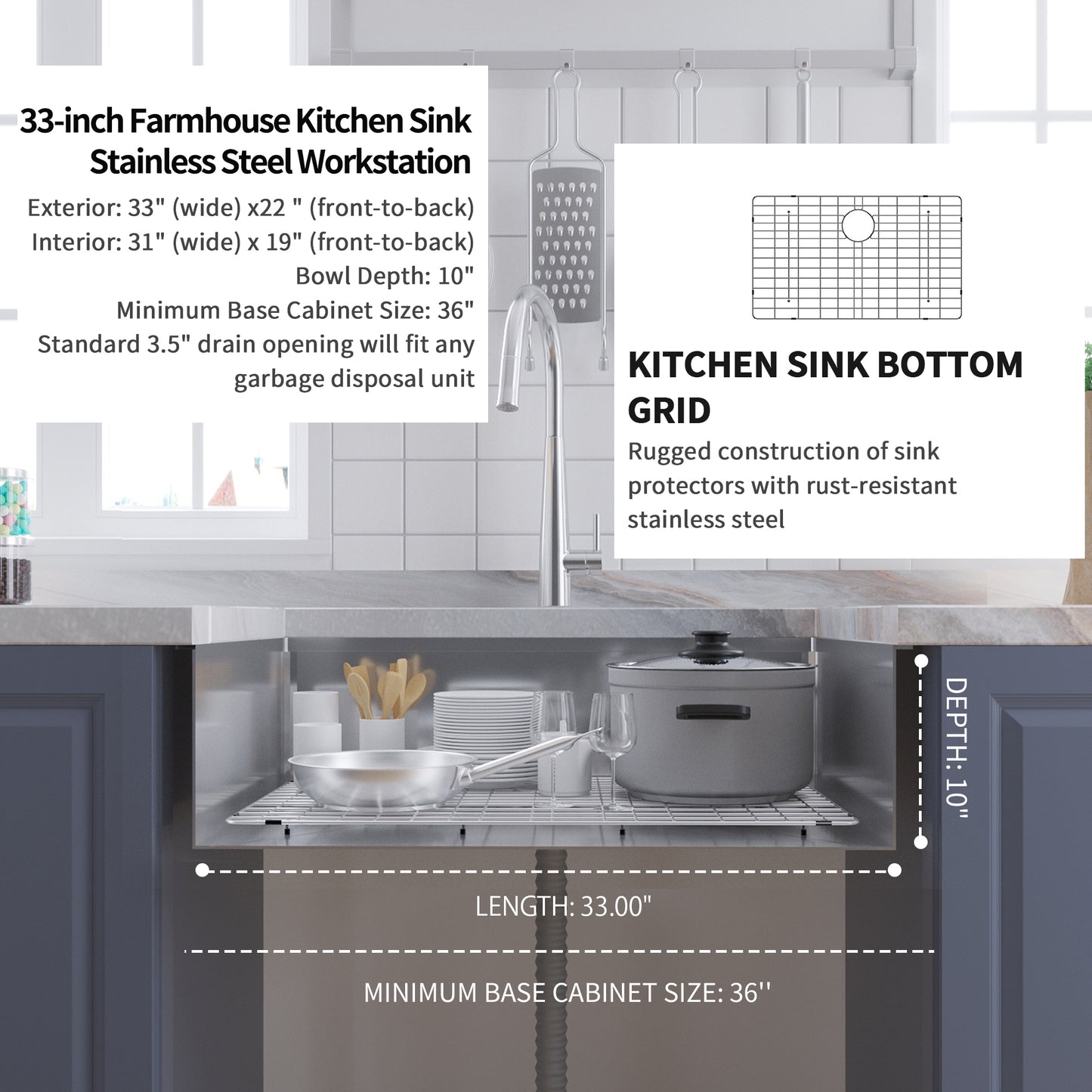 - Bonus Accessories: Package with 33' x 22' x 9' (fits the minimum cabinet size is 36 inch) farmhouse stainless steel sink, cutting board, colander, roll up rack, mounting clips, basket strainer drain and bottom grid.