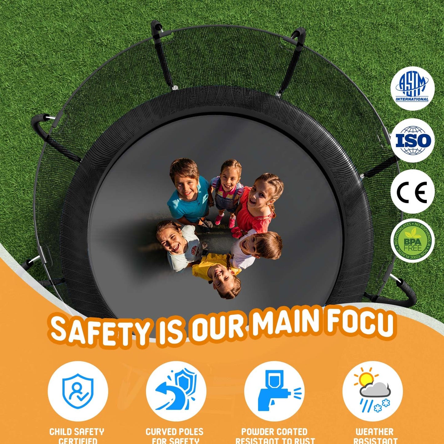 - PREMIUM QUALITY -- Our Trampoline is Premium Quality. The heavy-duty PP jumping mat is stitched perfectly well. All springs and top rails are designed for fixing the whole trampoline. It offers you a sense of secure feeling while you jump on the mat. All trampoline materials have passed quality inspections and environmental protection inspections. Each trampoline is manufactured by our professional factory, and each trampoline must pass CE, TUV, GS safety certification.