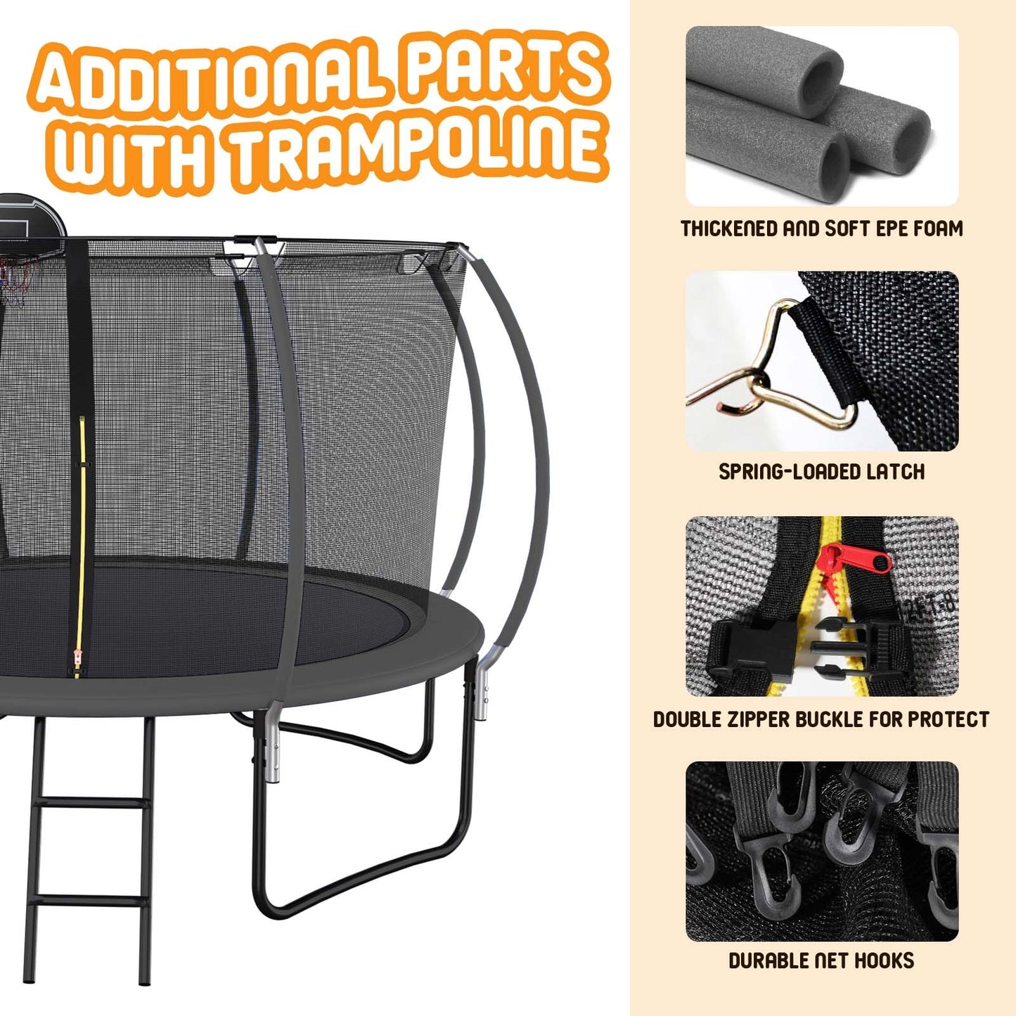 12 FT TRAMPOLINE BLACK PUMPKIN-STYLE SAFETY NET WITH BASKETBALL HOOP
