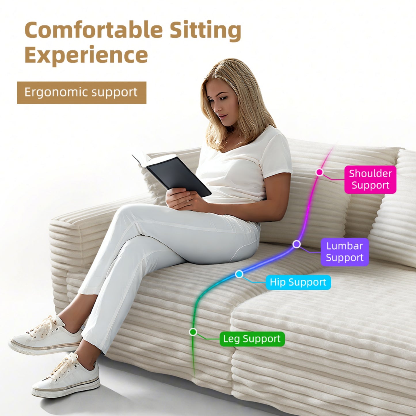 This sofa is designed for ultimate comfort, combining exquisite craftsmanship and user-friendly features to create a comprehensive relaxation experience for you. The sofa is filled with high-density sponge and high-quality cotton, paired with carefully designed rear pillows and luxurious cushions, providing unparalleled full body support. Whether it's reading or daily rest, you can enjoy cloud like comfort. Its sturdy solid wood frame and metal spring seat cushion can support up to 1000LB of weight, making it rock stable when used by four adults. The frame is durable and will not deform. The surface is made of skin friendly plush corduroy fabric, which feels soft as silk and has a unique texture. The accompanying multifunctional footstool can be freely adjusted in position, can extend into a segmented/U-shaped sofa, or can be used as a standalone footstool or small coffee table. The sofa can be easily converted into a recliner mode to meet various leisure scenes. Easy to install, assembly can be completed in just 10 minutes (note: vacuum packaged seat cushions need to be left to stand for 48 hours to restore their original state), showcasing quality in every detail from materials to functionality, redefining a comfortable home experience.