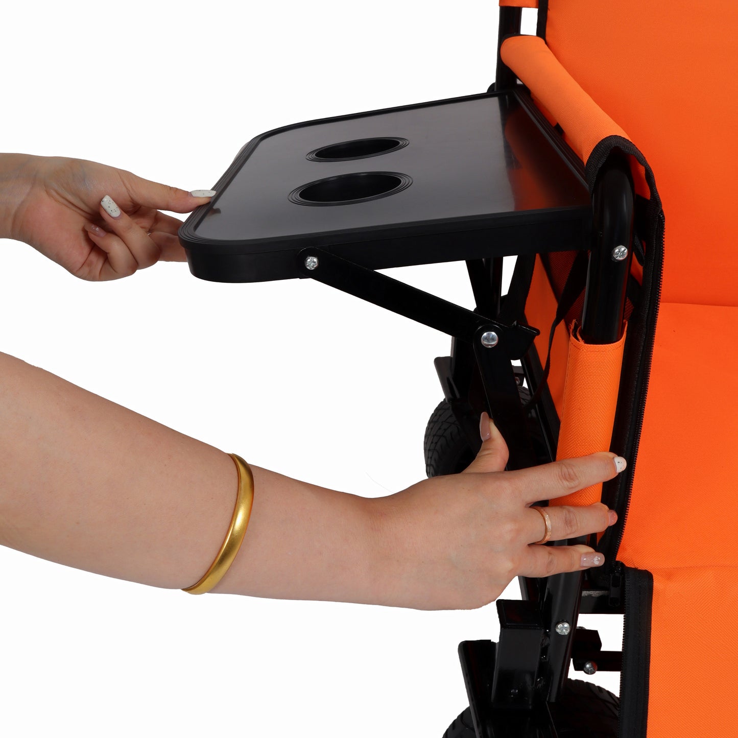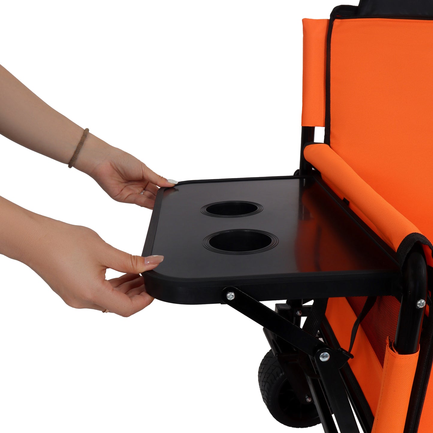 - Rear-Mounted Folding Tabletop for [Folding Cart/Vehicle Type] - Holds 2 Drinks!Securely attaches to the rear of your folding cart, wagon. Features a convenient folding tabletop that stows away when not needed.Integrated dual cup holders securely keep two drinks (cups, bottles, cans) upright.Perfect for keeping beverages, or small items within easy reach during transport, picnics, events, or work.